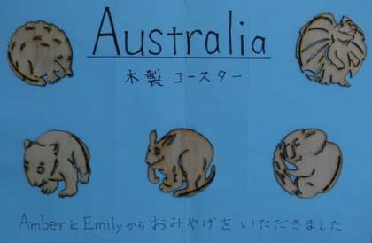 オーストラリアのお土産「木製コースター」も二人からいただきました。校長室前に飾っていますので、ご覧ください。