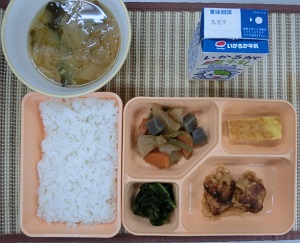 ☆「鶏肉のごま風味揚げ」は、料理酒、みりん、しょうゆで下味を付けた鶏肉に、小麦粉、でんぷん、ごまを合わせてつくった衣をつけ、油で揚げた料理です。香ばしいごまの風味を感じることができます。これに、「だいこんとこんにゃくの煮もの」、「卵焼き」、「小松菜のおひたし」、「みそ汁」を組み合わせています。“揚げもの”、“煮もの”、“焼きもの”などがバランスよく組み合わされた献立です。
