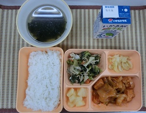 ☆今日は、中華風の料理が中心です。好評なチリソースの料理ですが、今回はえびとあつあげを使用しています。「豚肉とチンゲンサイの炒めもの」に使用している“チンゲンサイ”は中国から伝わった野菜で、日本で広く普及した中国野菜の1つです。火を通してもシャキシャキした食感が残る野菜で、油で炒めると鮮やかな淡緑色がより一層鮮やかになります。
