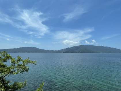 バスは福井県に入りました。とても良い天気です。 高速道路を降り、敦賀湾を臨みます。