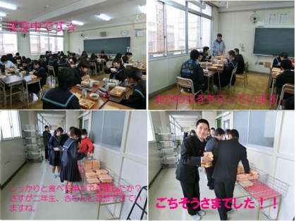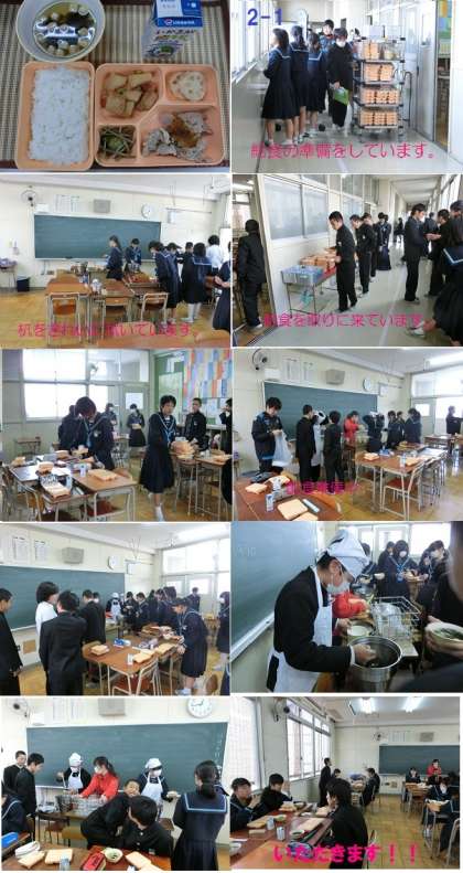 さて、本日の給食訪問は2−1です。配膳員さんがエレベーターホールまで運んでくださった給食を、各クラスの日直が協力して取りに行きます。(日直ができない日は、ボランティアで応援してくれる生徒もいます。)廊下に置いてある給食を、各自取りに行きます。もちろん係りに当たっている、友人の分も持って行ってあげます。このように学校給食では、「学校生活を豊かにし、明るい社交性及び協同の精神を養うこと。」を目標の一つとしています。