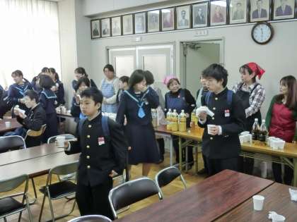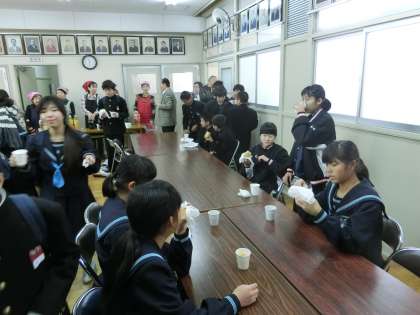 ニコニコしながら、手作りのたまごドックやジュースを頂く中学生、どうか安全に健康に冬休みが過ごせますように、保護者・地域の方々、見守りをよろしくお願いします