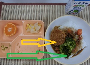 *今日は牛肉を使用したカレールウです。これに中学校給食で初めて登場する「ミンチカツ」を組み合わせており、「ミンチカツカレーライス」としていただきます。また、副食容器の一番小さなコーナーに入っている「ブロッコリー」もトッピングすると、彩りよく美味しくいただけます。