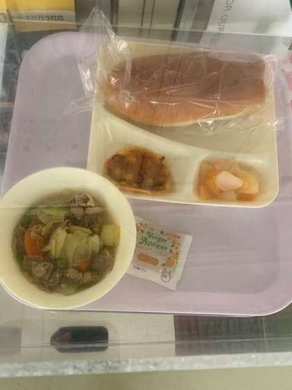 コッペパン、変わりピザ、鶏肉と野菜のカレースープ煮、ミックスフルーツ、牛乳です。