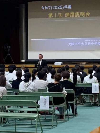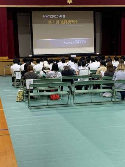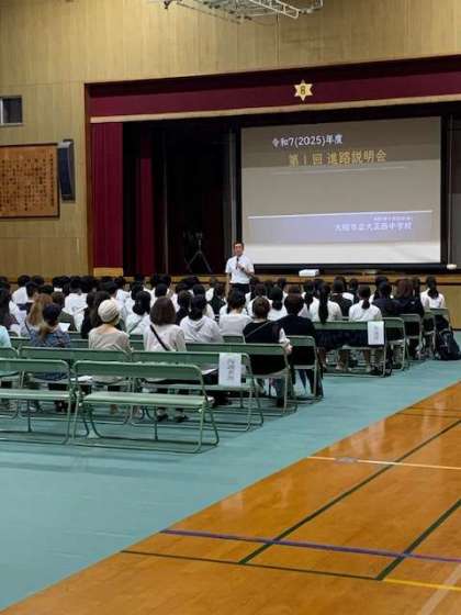 本日6限目の時間を利用して、体育館で第一回進路説明会を行いました。保護者の方々もたくさん出席していただきありがとうございました。欠席された保護者の方には子どもさんを通じて資料をお届けしますのでよろしくお願いします。