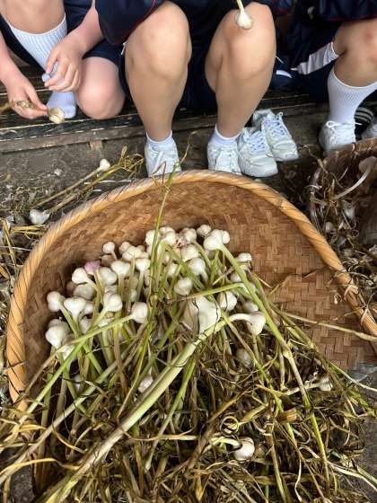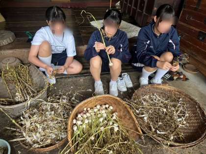 収穫したにんにくの皮を剥いています!