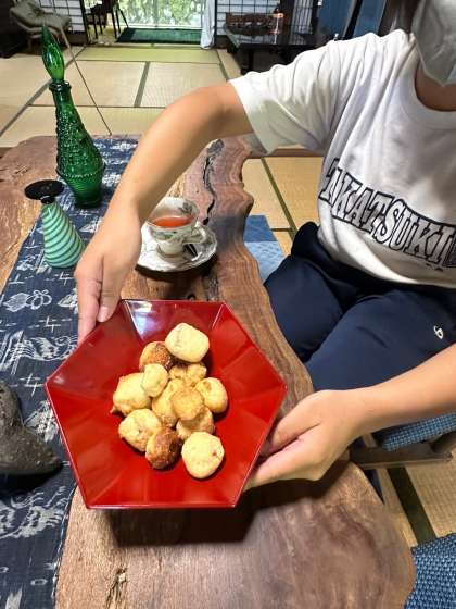 手作りのドーナツ、葉っぱ寿司と手作りのハーブティーでティータイムです!