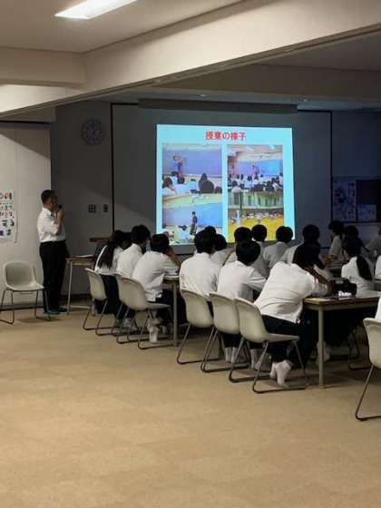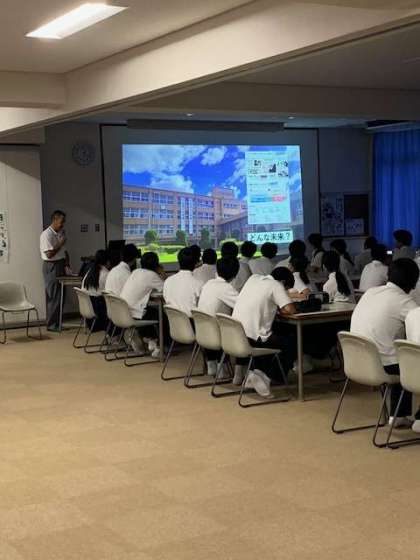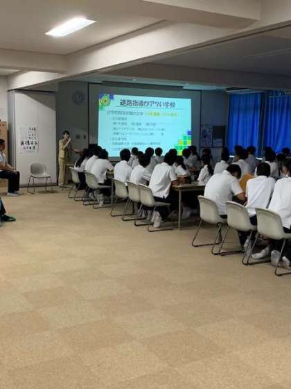 先日の私立高校説明会に続いて本日は公立高校の説明会を5時間目の時間を使って3年生生徒に向けて行いました。西成高校、鶴見商業、港高校より進路担当の先生に来ていただいて、それぞれの高校の特徴や学習カリキュラム、学校生活の様子などを説明していただきました。生徒たちも熱心に聞いていました。進路選択の参考にしてほしいと思います。