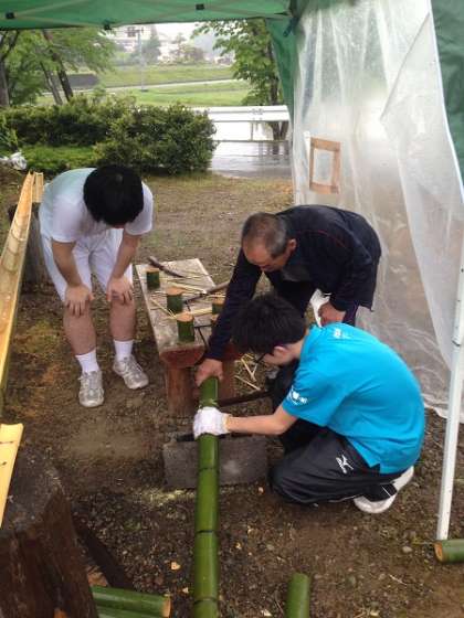 【写真上】竹を切っての竹細工体験中です!