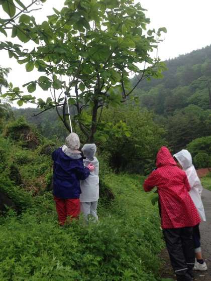 【写真中】夕食で使用する朴葉を収穫中です!