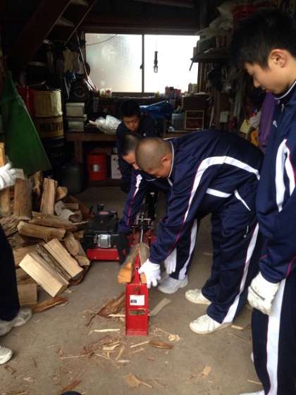 【写真下】薪作り体験中です!