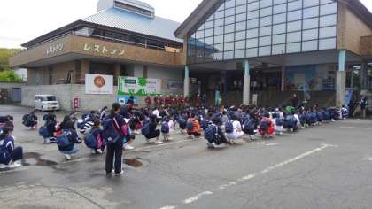 【写真下】ひるがの高原に学年全員元気に集合、雨も上がりました!