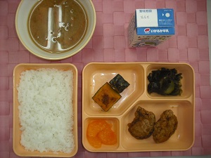 「かぼちゃのしょうゆ焼き」や「きゅうりとわかめの酢のもの」には、夏が旬のかぼちゃやきゅうりを使っています。これらに「みそけんちん汁」、「みかん缶詰」を組み合わせた和風献立です。