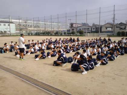 予定通り7時半集合完了。出発式が行われ、いよいよ一年生の一泊移住がスタートしました。