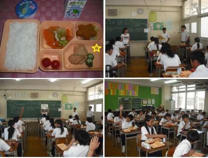 ☆7月7日は「たなばた」ということで、給食の時間に「たなばたクイズ」をしました。クイズは「たなばたは、英語でなんというでしょう?」という三択式で、1.Seven Evening 2.the Star Festival 3.Milky Wayから正解と思うものに手をあげます。1/3位の人が正解だったでしょうか。でも、1問で終わらないのが流石英語の先生!願いを書いた短冊やかざりをつるす「竹」は英語でなんて言うのかな?と続き、最後に「神様」は英語で?と英語でいっぱいの給食時間になりました。