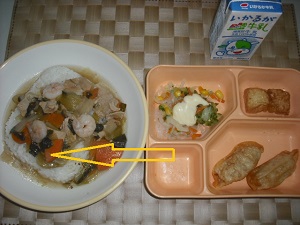 ☆今日の給食は中華風の献立です。「中華丼」は深皿にご飯を移し、食缶で届いた中華丼のあんをかけ、おかずの容器に入っているえびをトッピングしていただきます。えびが別に入っているのは、えびアレルギーの生徒も同じものを食べられるように考えられているためです。また白菜・チンゲンサイなどの野菜も豊富に使われています。