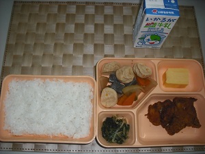 ☆今日の給食は和食の献立になっています。人気のメニュー「鶏肉の竜田揚げ」は、鶏肉にしょうが、みりん、酒、濃口しょうゆで下味をつけ、でんぷんをまぶし、油で揚げています。これはおかわりが出るほどの人気だったのですが、「一口がんもとだいこんの煮もの」に使用されている「にんじん」が苦手な人が時々見られました。「にんじん」にはカロテンが多く含まれ、免疫力を高めたり、皮ふを健康に保ったり、視力を維持する働きがあります。苦手な人もがんばって食べてくださいね。