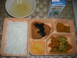 ☆今日は洋風献立です。「鶏肉のカレー炒め」は、鶏肉を主材にたまめぎ、にんじん、ピーマンをカレー風味に炒めています。「とうがんのスープ」に使用しているとうがんは、淡泊な味なので、和風の煮ものや汁物だけでなく、洋風のスープにもよく合います。とうがんの栄養成分には、余分な塩分を排出して血圧を正常に保つ働きをするカリウムがあります。老廃物の排泄を促す作用やむくみの解消にも役に立つといわれています。カルシウムも、実の野菜としては多いほうです。また皮や種に利尿作用や解毒作用があるとして、生薬として使われることもあるそうです。ちなみに、皮は炒めもの、わたは汁物の具などに活用できる、低カロリーでエコな食材です。