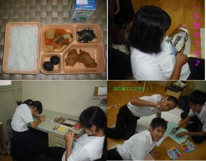 さて、給食日誌の場をお借りして「保健委員会(給食文化祭掲示)」の活動を少しご紹介させてください。今年のテーマは、「朝食」で、毎月発行している「食育つうしん」を参考に「朝食新聞」を作成しています。メンバーは有志ということで主に前期・後期の3年生が活動します。写真は、体育大会や文化祭のクラス活動で忙しい合間にがんばってくれている前期保健委員生徒の姿です。最近「食育」という言葉をよく耳にしますが、子どもたちから発信される「食育」は学校内だけでなく、どこまでも伝わっていく特別なものに感じるのは私だけでしょうか!?大正西中学校で第一号となる「朝食新聞」、ぜひ見に来てください!!