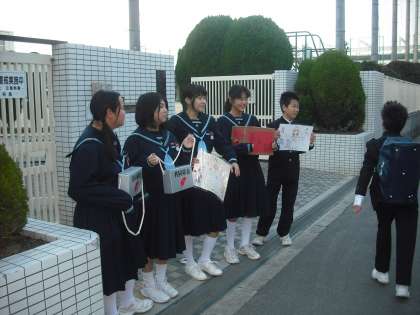 朝のとても冷え込む中、生徒会役員が募金箱を持って、登校して来る生徒たちに募金を呼びかけました。