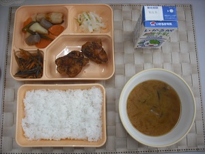 ☆「鶏肉の竜田揚げ」は、鶏肉にしょうが、みりん、酒、こい口しょうゆで下味をつけ、でんぷんをまぶし、油で揚げたものです。これに「ちくわとこんにゃくの煮もの」、「だいこんときゅうりの即席づけ」、「きんぴらごぼう」、「みそ汁」を組み合わせ和風献立にしています。「みそ汁」はたまねぎとわかめのみそ汁です。