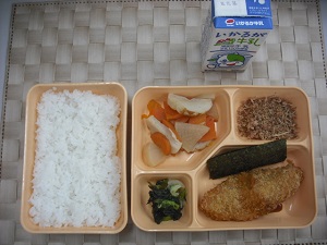 さて、本日の献立の一つ「かつおぶしとじゃこのいり煮」の「じゃこ」とは、イワシやいかなごの稚魚を乾燥した「ちりめんじゃこ」で、カルシウムを多く含んでいますので、苦手な人も残さずに食べほしい料理です。米飯にかけるとより美味しくいただくことができます。