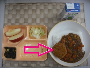 ☆今日は定番のカレーライスに各自で「一口カツ」をのせていただく、「カツカレーライス」です。「いつものブロッコリーより、カツの方がうれしい。」という声が聞こえましたが、野菜もしっかり食べてくださいね。「キャベツときゅうりのサラダ」に使われている「キャベツ」は、古代ギリシャやローマでも食べられていた世界最古の野菜の一つで、世界でもっともポピュラーな葉野菜と言われています。外葉には、ビタミンCやカロテンが多く、カルシウムも含まれています。中でも特徴的な栄養素としてあげられるのが、「ビタミンU」。胃酸の分泌を抑え、粘膜の修復を助ける働きがあるそうです。「ビタミンU」は熱に弱いので、生で食べると効果的です。