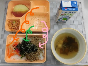 ☆「ビビンバ」は、野菜が苦手な人も「残さず食べることができる♪」という声が多い、人気の献立の一つです。米飯の上に「肉炒め・ほうれん草・ナムル」をのせ、「きざみのり」をふりかけて混ぜながら食べましょう。のせる量を調節すると、うまく食べることができますよ。