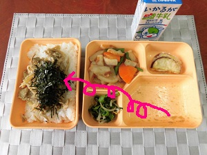☆「鶏ごぼうご飯」は、米飯と具材を混ぜて「きざみのり」をかけていただきましょう♪