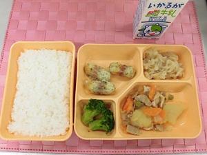 ☆今日は豚肉を主材とした「豚じゃが」が登場します。関西で「肉じゃが」というと牛肉を使用しますが、関東では豚肉を使用することが多いようです。大阪市の中学校給食では違いがわかるように「肉じゃが」と「豚じゃが」と呼んでいます。