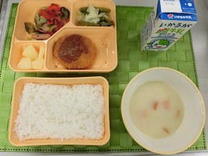 主菜は鶏肉を主材とした「チキンカツ」です。「キャベツとアスパラガスのサラダ」のグリーンアスパラガスは茎の部分を食べる野菜で、4月から6月に旬をむかえます。たくさん日光を浴びて光合成をすることできれいな緑色になります。日光を当てずに栽培すると白色の「ホワイトアスパラガス」になります。