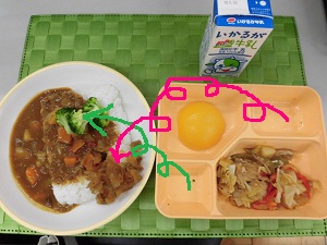 ☆今日の「カレーライス」は牛挽肉を主材とした「ミートカレーライス」です。食べる時は専用の深皿に入れたご飯に、温かい「カレールウ」をかけ、副食容器に入った「ブロッコリー」を各自でトッピングして食べましょう。「福神漬け」も組み合わせています。