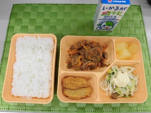 ☆副食とは、主菜と副菜、汁もののことです。今日の主菜は、「牛肉のケチャップ炒め」です。副菜は「スパゲッティサラダ」、「てり焼きナゲット」、「りんご缶詰」です。