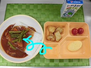 ☆「ハヤシライス」は、専用の深皿に移したご飯に保温食缶で届いた温かい「ハヤシルウ」をかけ、仕上げにこの季節が旬の「グリーンアスパラガス」を添えて食べましょう。