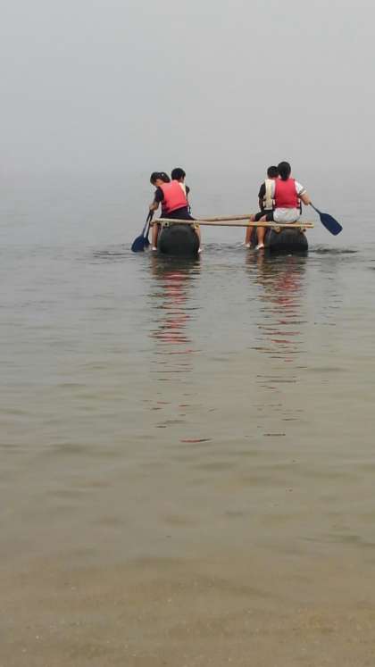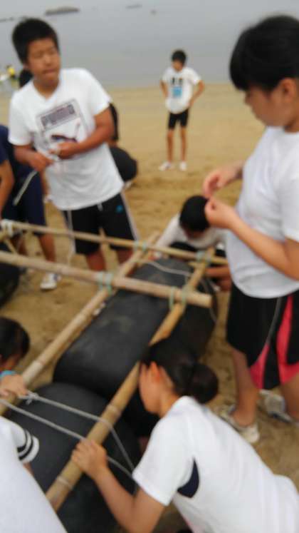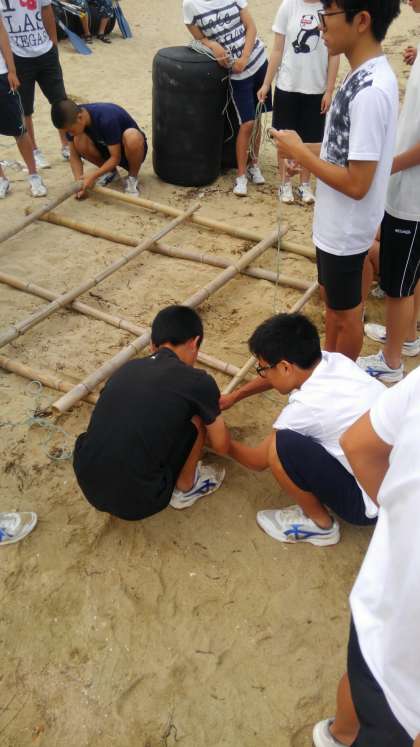 竹を組んで、ブイ(浮き)を縛りつけて筏を作ります。