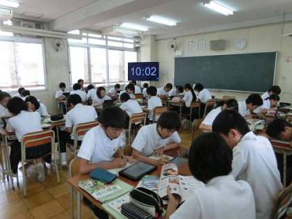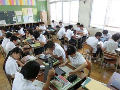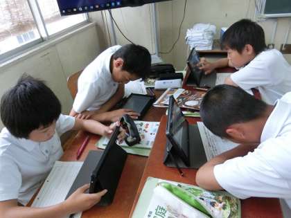 6月16日(金)2年生家庭科の時間です。タブレットを使って、班で調べ学習です。