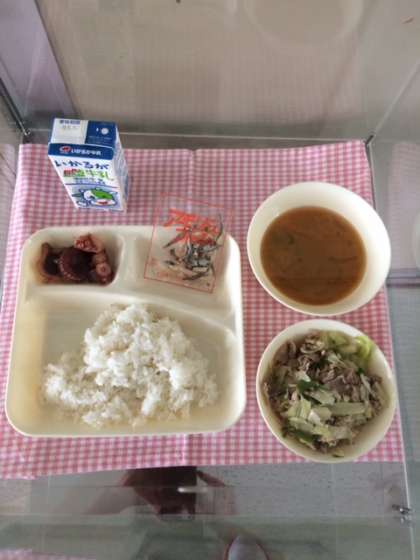 みそ汁の具材は、とうふ、にんじん、たまねぎ、かぼちゃ、青ねぎです。少しかぼちゃが溶けて、ほんのり甘みのある味わいは大変好評で、おかわりの人が多く出たそうです。お出汁がしっかりととれていたのと、赤みそと白みその合わせみその効果もあったのでしょう。