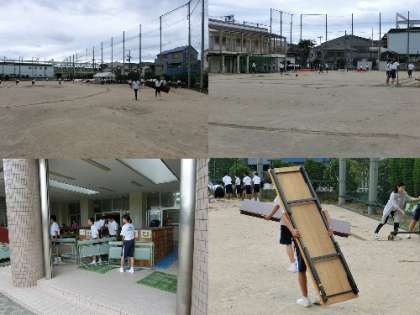 午後からは、準備です。ぬかるんだグランドを整地し、荷物を運び、入退場門が出来上がりました。