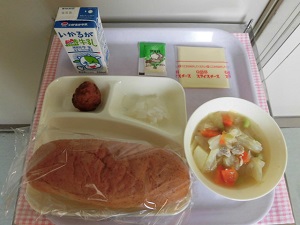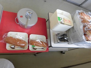 いつもより配食する数が多いので、「効率よく給食活動をすすめるにはどうしたらよいのか」「少しでも食べる時間を確保したい…」ということで、2年生(他の学年は見ることができていませんが)はこのような見本を作っていました。そのせいか、配食数の多い今日も手早く配食完了、スムーズに食べることができました。その後、おかわり常連クラスは、先生が「おかわりありますよ」と言うと「ハイハイハイ!!」と元気な返事で教室が包まれ、給食が足りず、ジャンケン大会になっていました。
