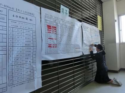 次は保健体育科です。 図書室の前に「体育歴代記録」を掲示していました。