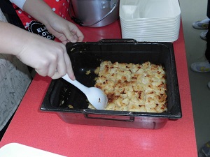 「桃のクラフティ」は、年に2回登場する手作りのデザートです。切り分けるのに時間がかかるのと、食器の一番小さいところに盛り付けるのは少し難しいのですが、(今日はクラスの教員が配食しやすいように切り分けていたようです☆)スムーズに配食しています。