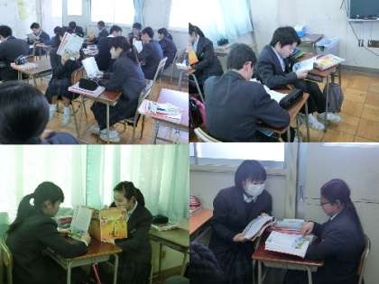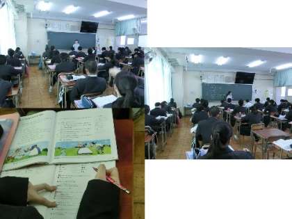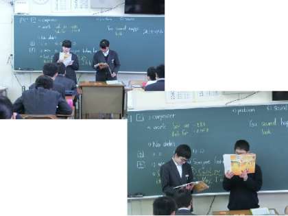 まずは、全体での速読練習。リーディングブックを用いて読解問題に挑戦。黒板を使っての学習。次にペアーリーディング練習。最後には、それをみんなの前で発表していました。