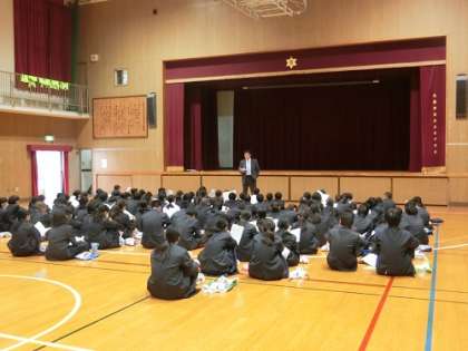 5月7日(月)1時間目、連休明けてすぐですが、一泊移住にむけて、学年主任の笠谷先生より生徒への説明がありました。
