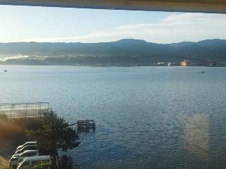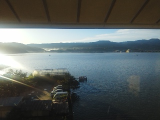 修学旅行3日目。本日快晴です。ホテルの窓から望む東郷湖です。