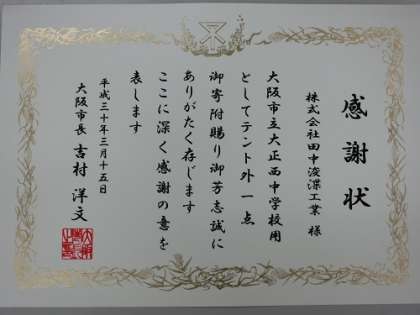 紀陽銀行様を通して、(株)田中浚渫工業様から、ワンタッチテント2張と軟式野球のボール(4球)を寄贈いただきました。