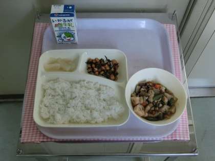 今日から給食が始まりました。 本日のメニューは、筑前煮・ひじき豆・だいこんのゆず風味です。