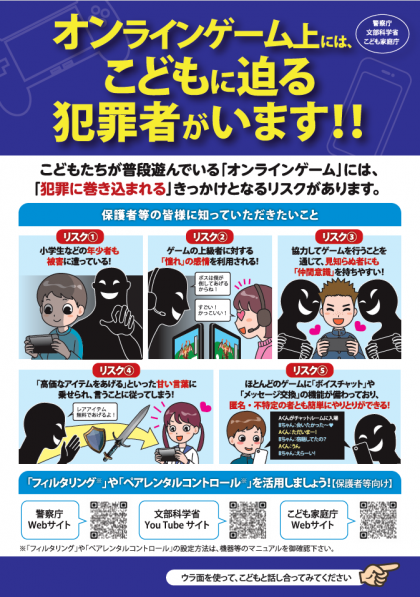 文部科学省からのお知らせです。オンラインゲーム上には、こどもに迫る犯罪者がいます!!