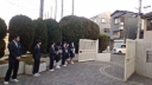 朝の登校風景です。生徒会と風紀委員があいさつ運動を行っています。