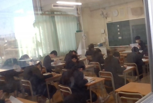 写真左と中は1年生、右は2年生の国語のテストの様子です。