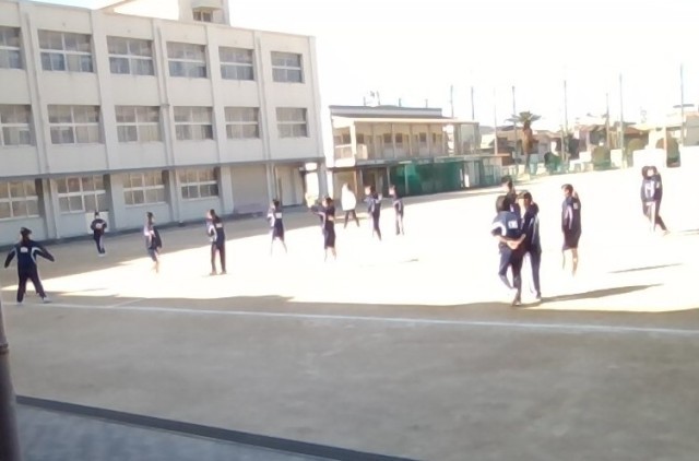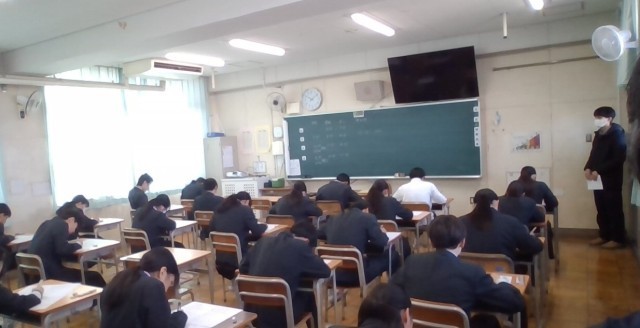 写真は上から1年生の英語のテストの様子、2年生の英語のテストの様子、3年生の体育の授業の様子です。